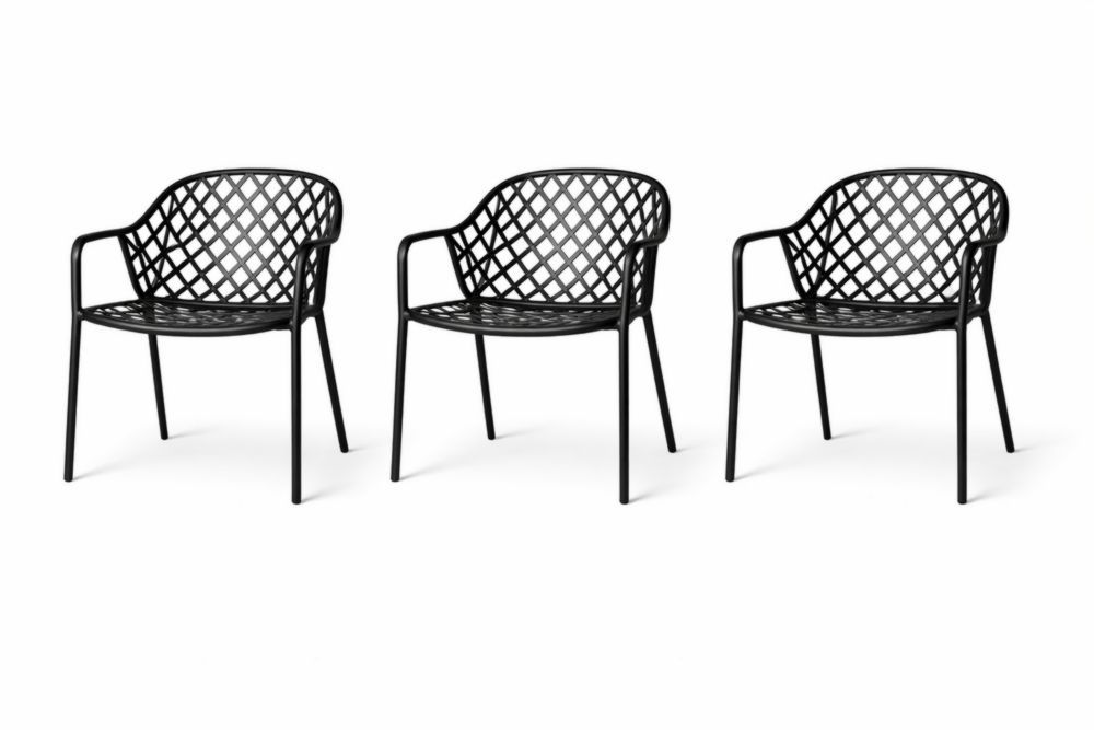 Set of 3 Black Metal Armchairs with Diamond Pattern Design
